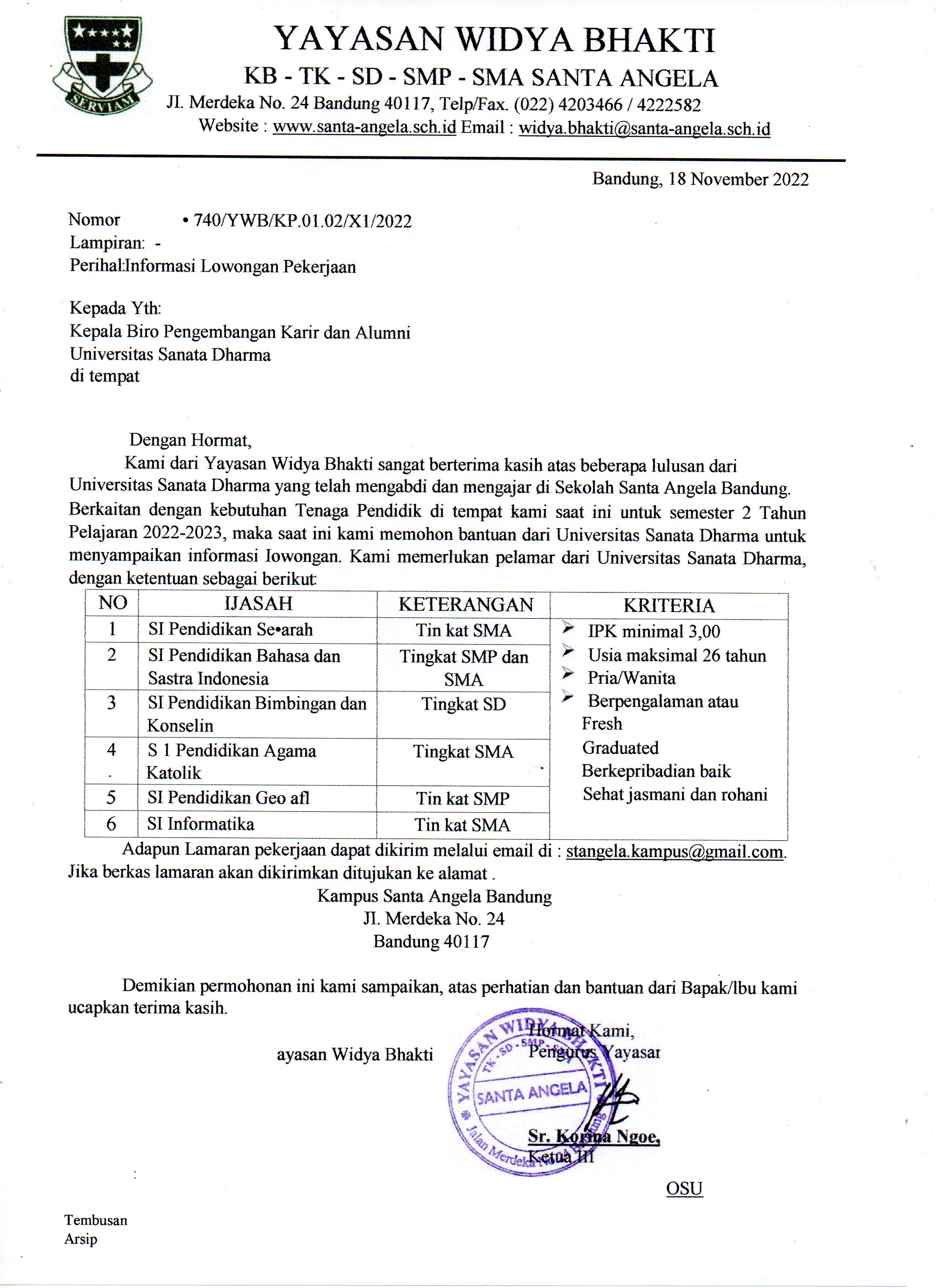 LOWONGAN YAYASAN SATYA BHAKTI KAMPUS SANTA ANGELA Dari : YAYASAN WIDYA BHAKTI Deadline : 28/02/2023 Ketegori : guru Jawa Barat | Kab., Bandung