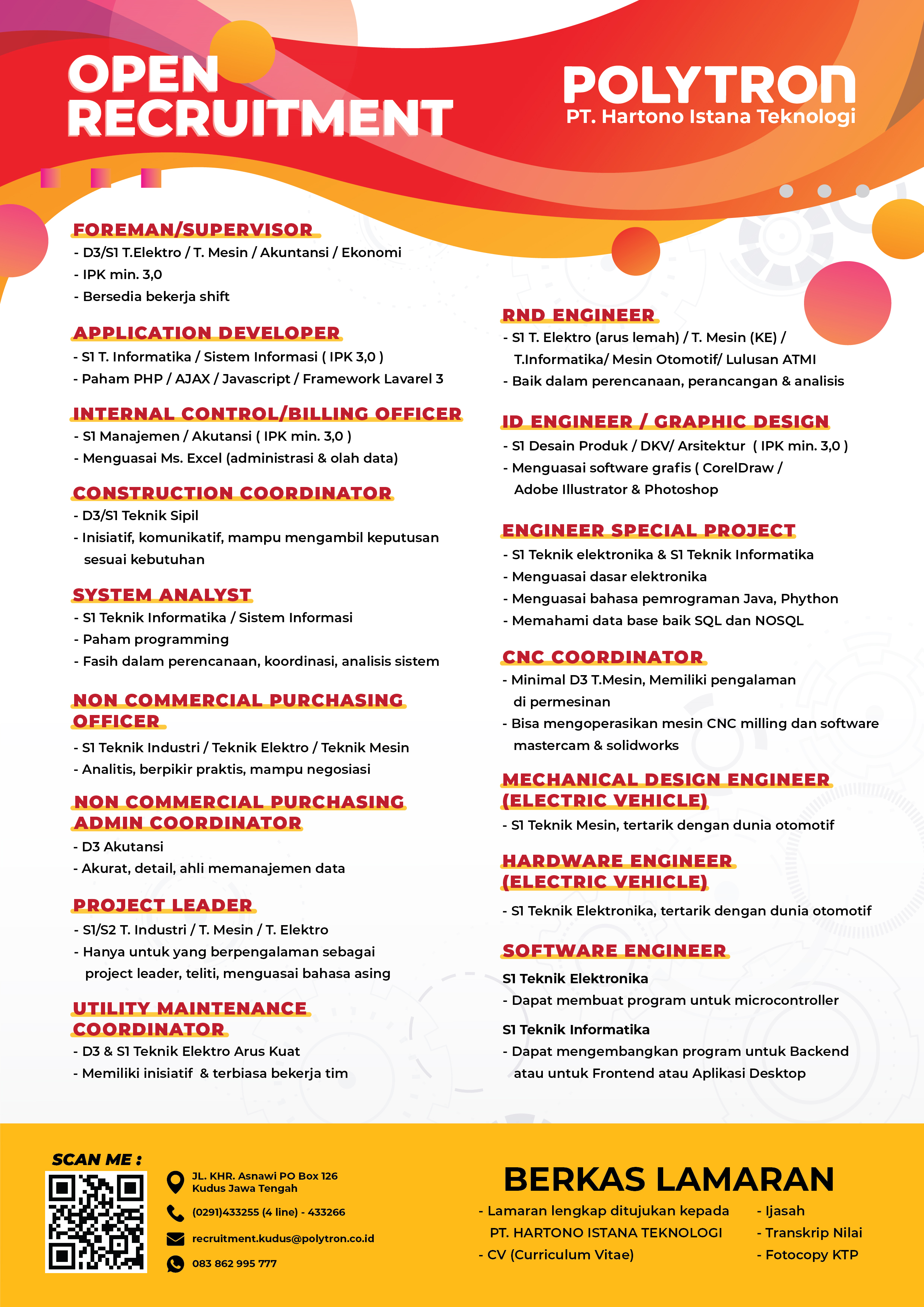 LOWONGAN PT. HARTONO ISTANA TEKNOLOGI (POLYTRON) Dari : PT. HARTONO ISTANA TEKNOLOGI (POLYTRON) Deadline : 31/05/2023 Ketegori : Jawa Tengah | Kab., Kudus