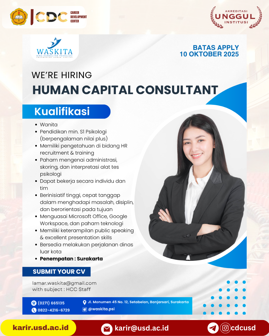 LOWONGAN WASKITA Dari : WASKITA Deadline : 10/10/2025 Ketegori : Human Capital Consultant Jawa Tengah | Kodya, Surakarta