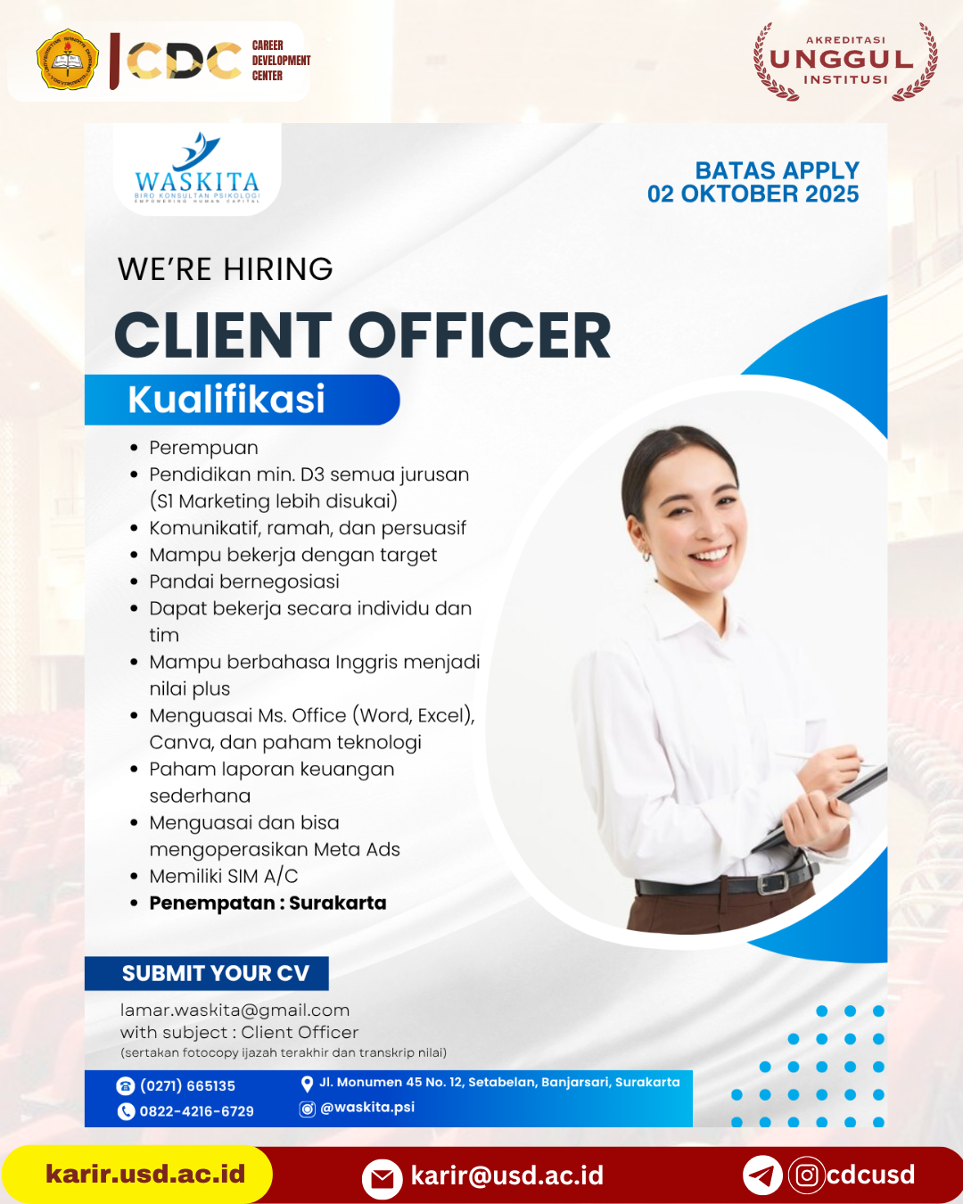 HATI-HATI TERHADAP PENIPUAN LOWONGAN PEKERJAAN ONLINE! Salah satu indikasi PENIPUAN adalah jika pelamar diminta untuk melakukan TRANSFER via ATM atau dimintai uang dengan cara lain. Bila mengetahui indikasi tsb hub: karirdanalumni@usd.ac.id
