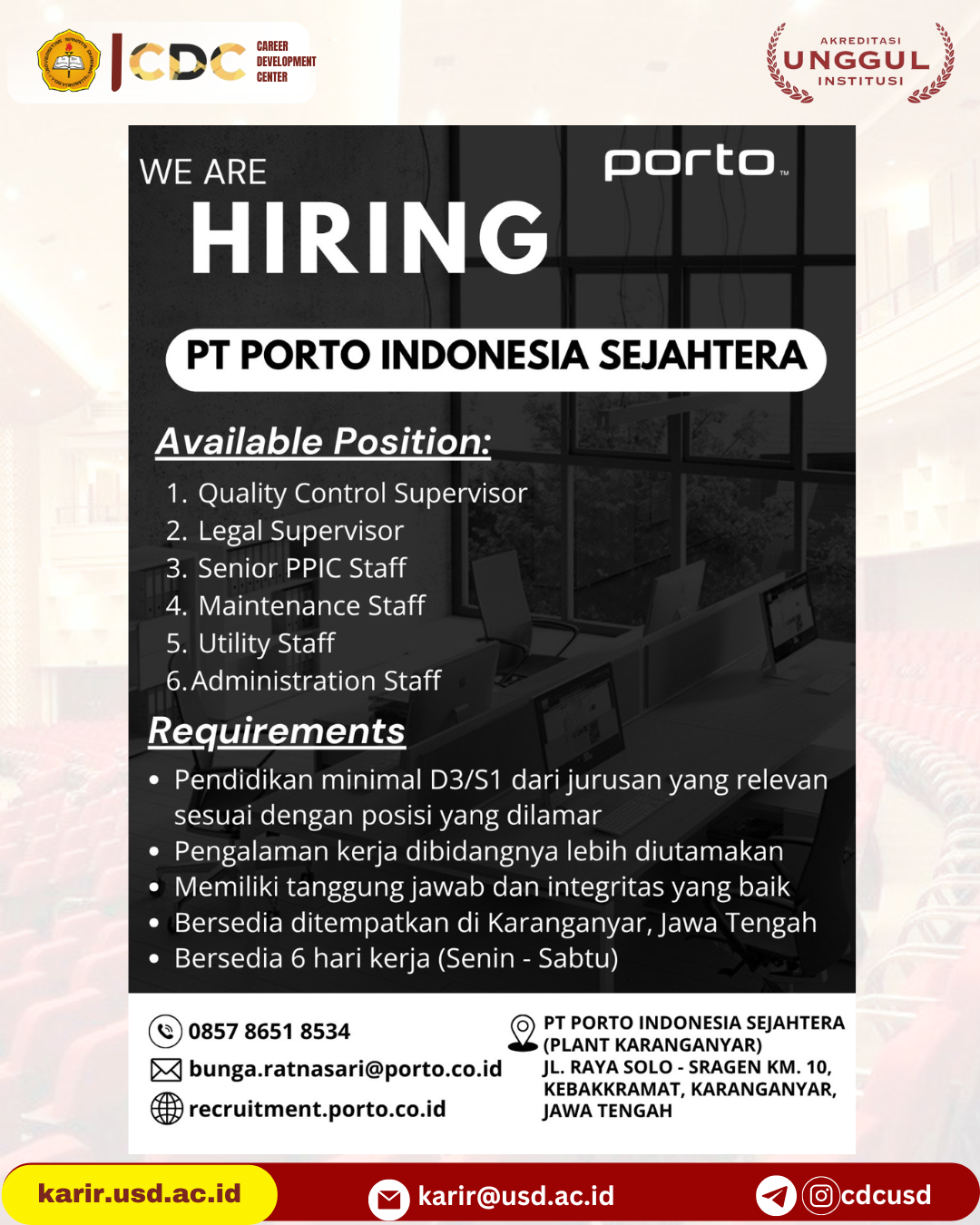Ketegori : Utility System Staff, Senior PPIC Staff, quality control, Maintenance Staff, Legal Supervisor, Administration Staff