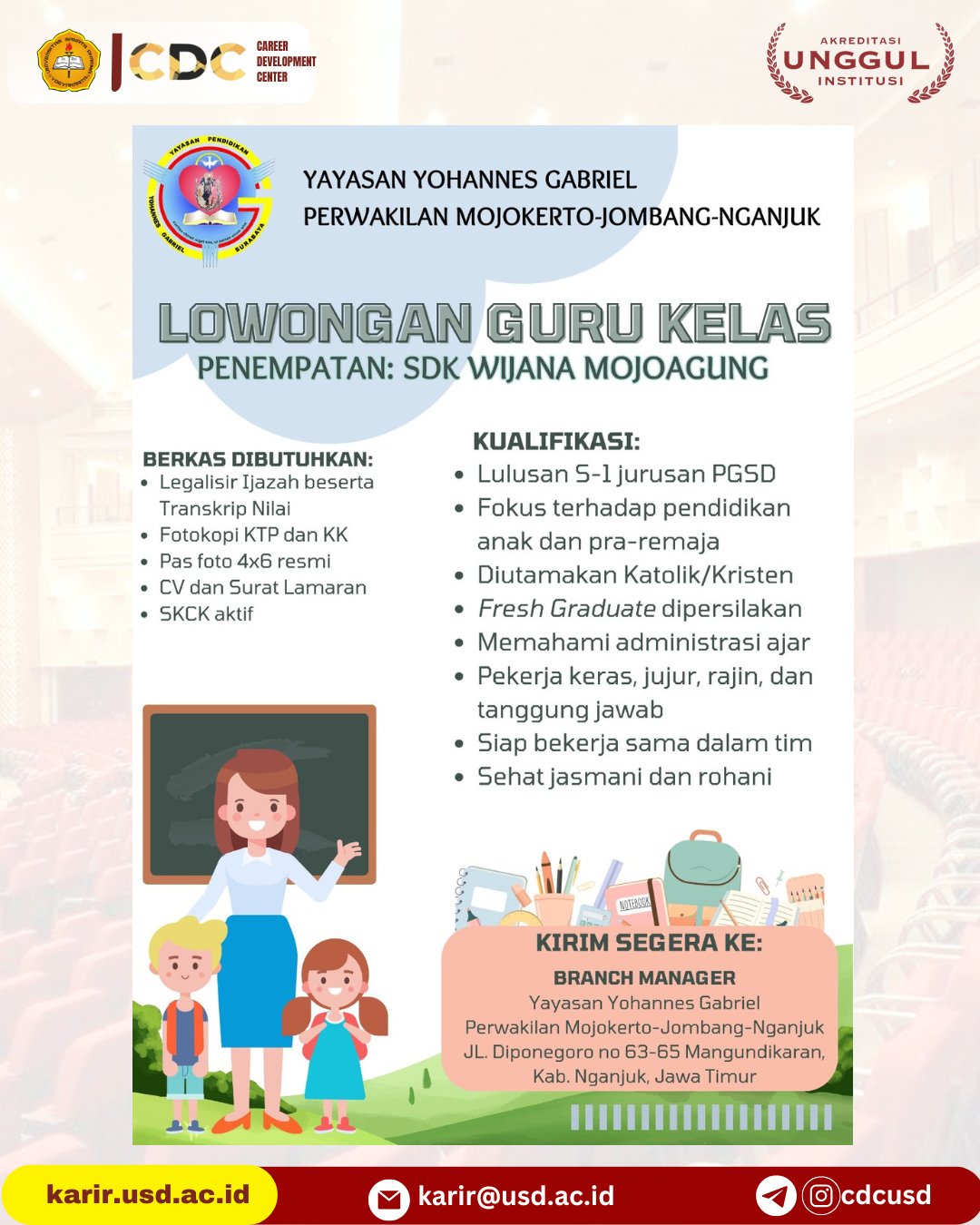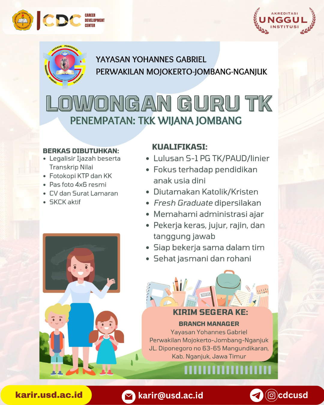 LOWONGAN YAYASAN YOHANNES GABRIEL Dari : Yayasan Yohannes Gabriel Deadline : 28/11/2025 Ketegori : guru Jawa Timur | Kab., Jombang