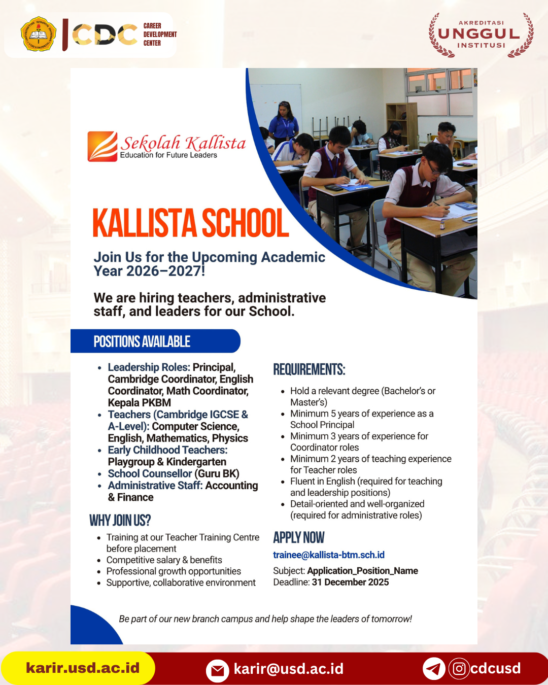 LOWONGAN SEKOLAH KALISTA Dari : SEKOLAH KALISTA Deadline : 31/12/2025 Ketegori : TEACHER Riau | Kodya, Batam