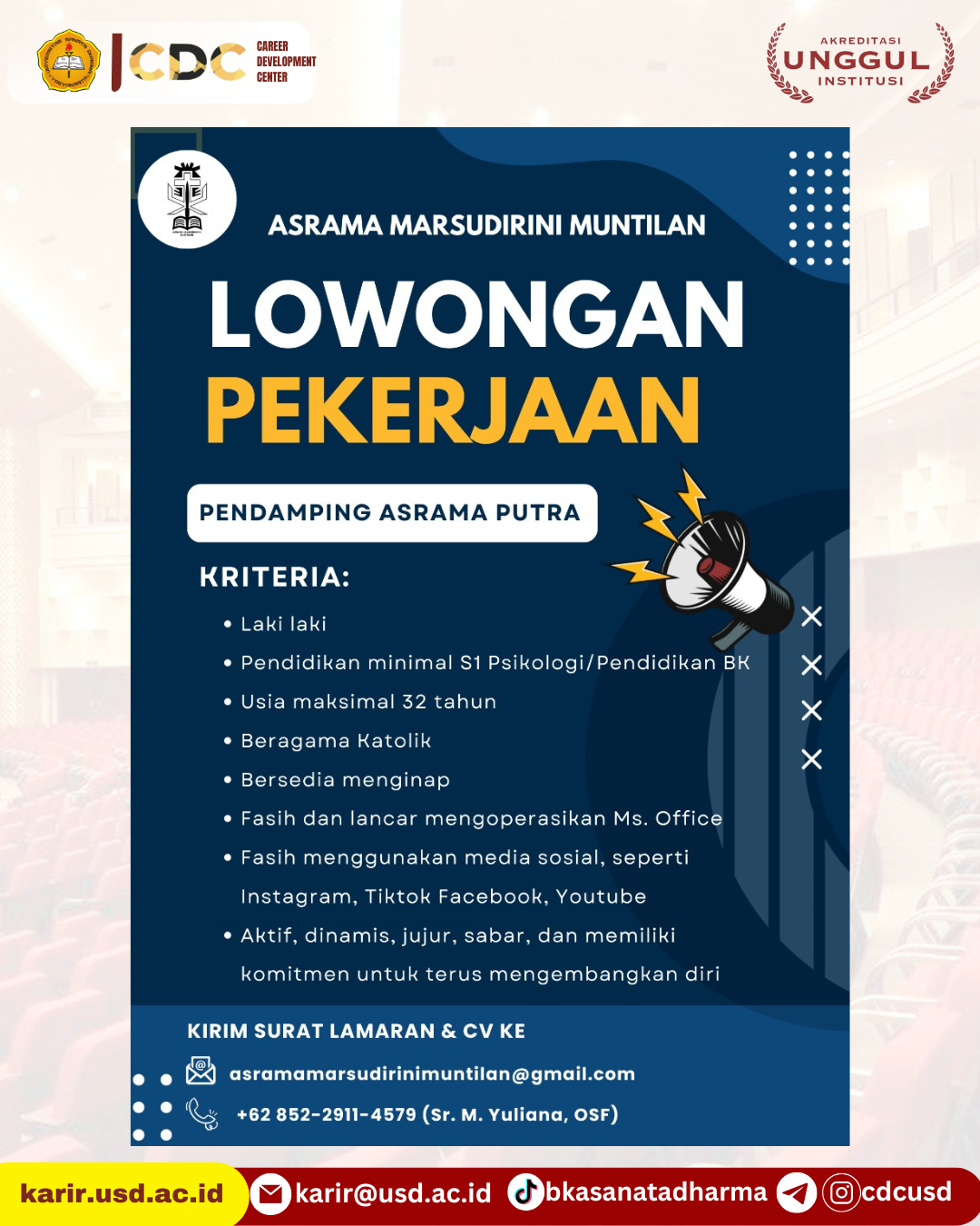 LOWONGAN ASRAMA MARSUDIRINI MUNTILAN Dari : YAYASAN MARSUDIRINI MUNTILAN Deadline : 20/12/2025 Ketegori : Jawa Tengah | Kab., Magelang