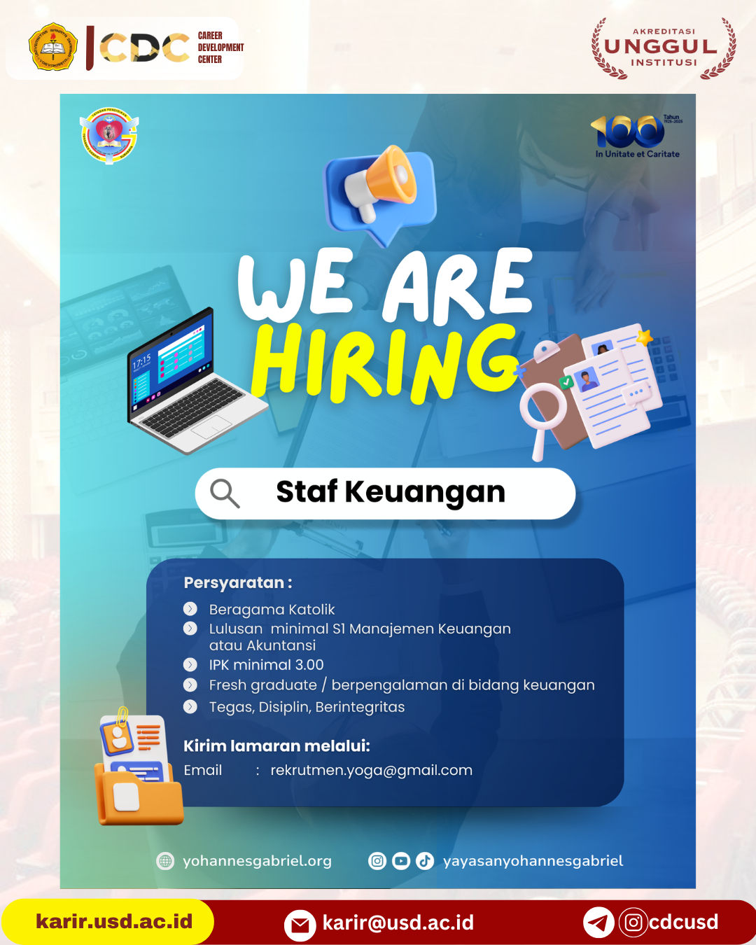 HATI-HATI TERHADAP PENIPUAN LOWONGAN PEKERJAAN ONLINE! Salah satu indikasi PENIPUAN adalah jika pelamar diminta untuk melakukan TRANSFER via ATM atau dimintai uang dengan cara lain. Bila mengetahui indikasi tsb hub: karirdanalumni@usd.ac.id
