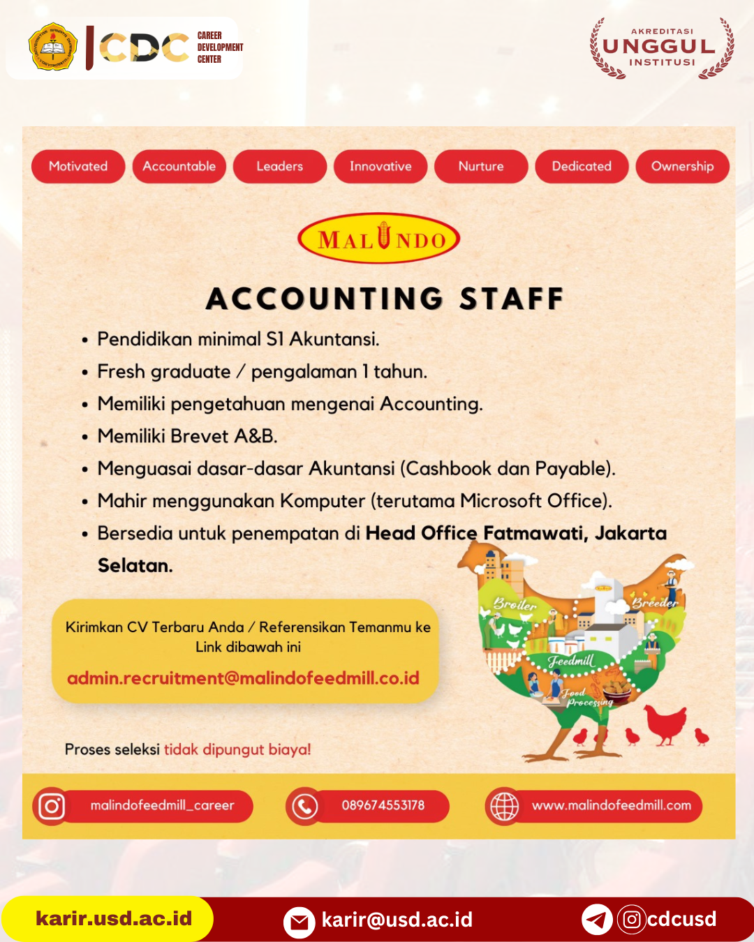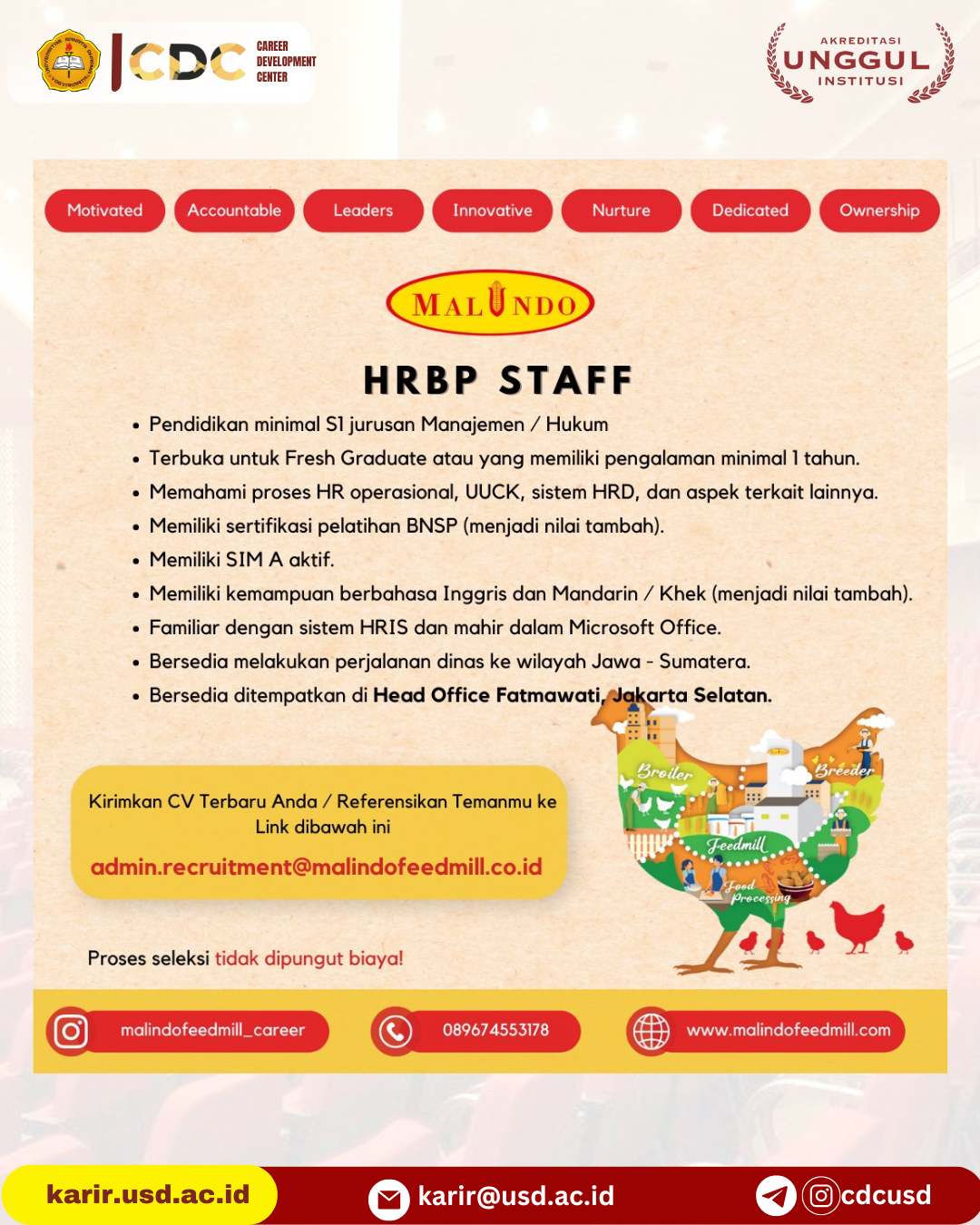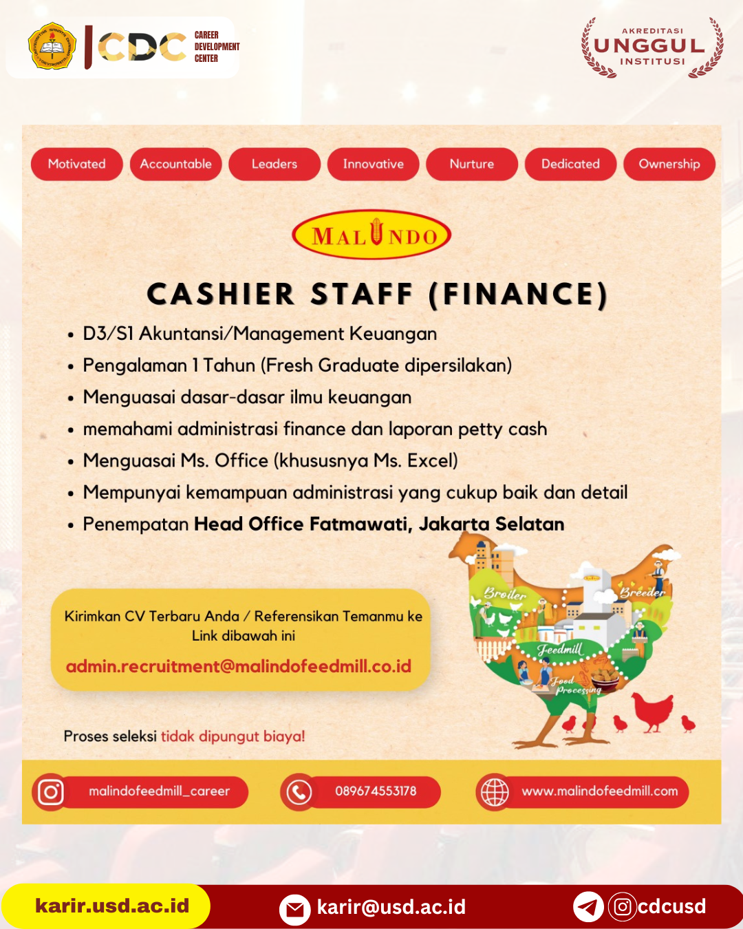 HATI-HATI TERHADAP PENIPUAN LOWONGAN PEKERJAAN ONLINE! Salah satu indikasi PENIPUAN adalah jika pelamar diminta untuk melakukan TRANSFER via ATM atau dimintai uang dengan cara lain. Bila mengetahui indikasi tsb hub: karirdanalumni@usd.ac.id