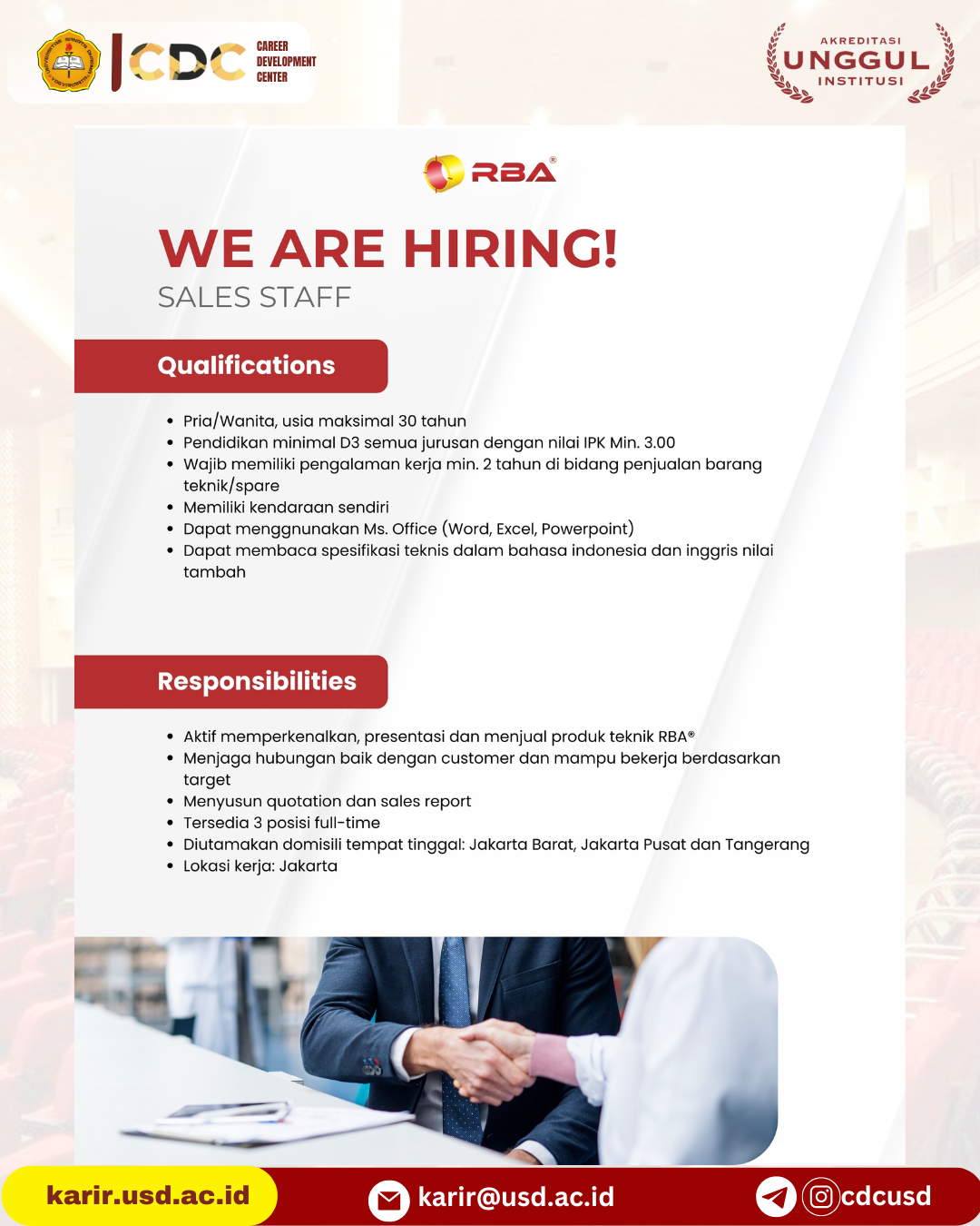 HATI-HATI TERHADAP PENIPUAN LOWONGAN PEKERJAAN ONLINE! Salah satu indikasi PENIPUAN adalah jika pelamar diminta untuk melakukan TRANSFER via ATM atau dimintai uang dengan cara lain. Bila mengetahui indikasi tsb hub: karirdanalumni@usd.ac.id