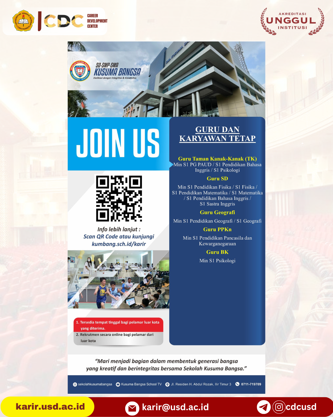 LOWONGAN SEKOLAH KUSUMA BANGSA Dari : SEKOLAH KUSUMA BANGSA Deadline : 28/02/2026 Ketegori : guru | Semua