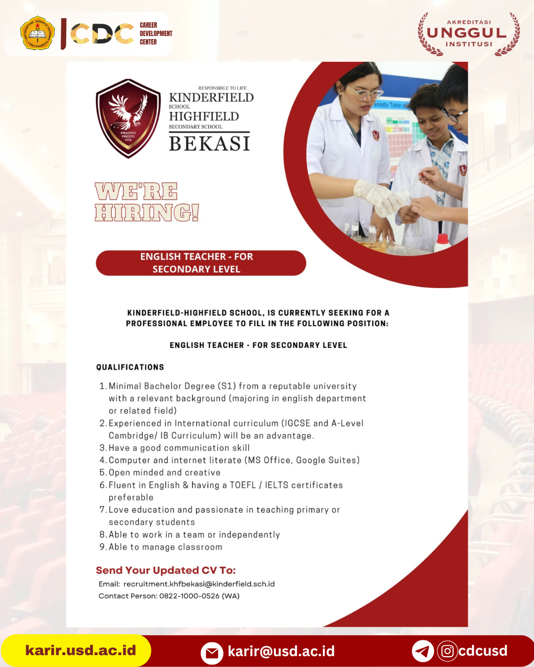 HATI-HATI TERHADAP PENIPUAN LOWONGAN PEKERJAAN ONLINE! Salah satu indikasi PENIPUAN adalah jika pelamar diminta untuk melakukan TRANSFER via ATM atau dimintai uang dengan cara lain. Bila mengetahui indikasi tsb hub: karirdanalumni@usd.ac.id