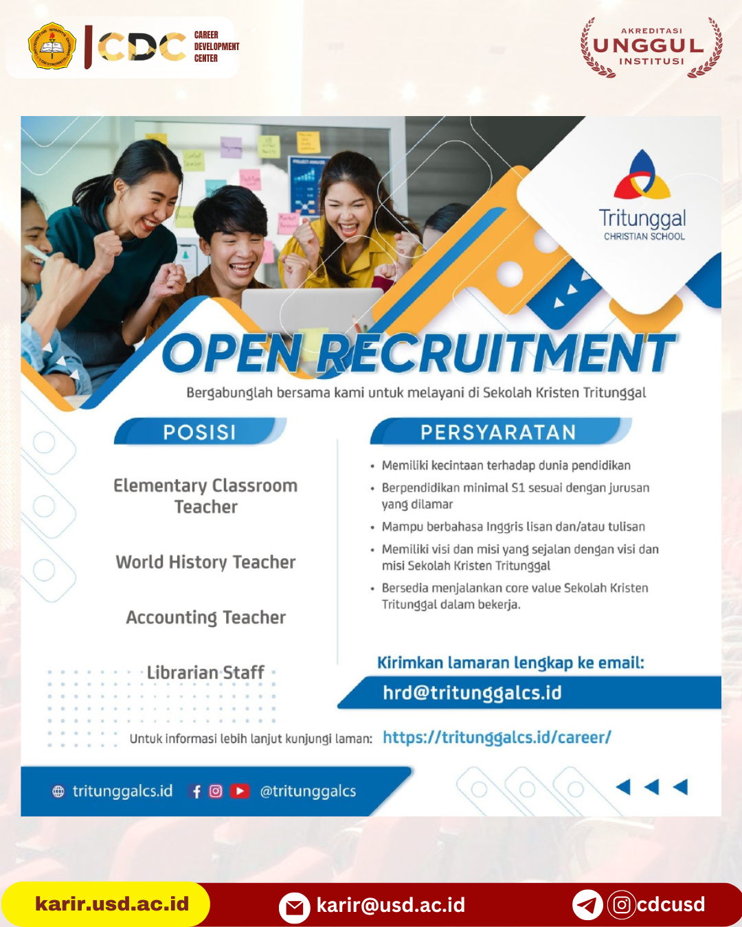 LOWONGAN TRITUNGGAL CHRISTIAN SCHOOL Dari : Tritunggal Christian School Deadline : 31/03/2026 Ketegori : Jawa Tengah | Kab., Semarang