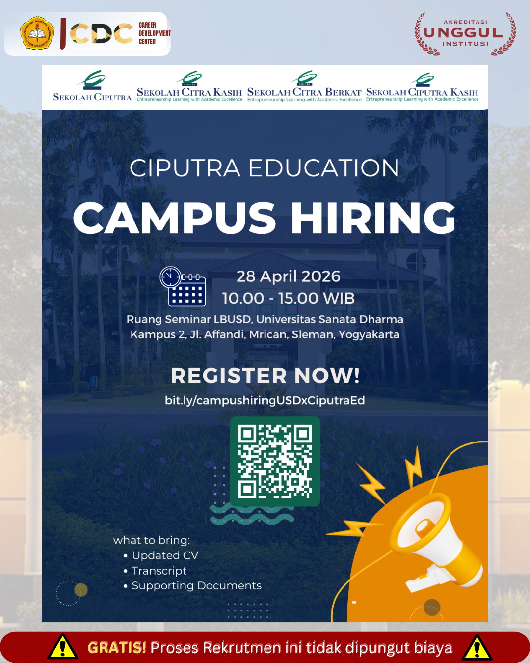 CAMPUS HIRING YAYASAN CIPUTRA PENDIDIKAN Dari : Yayasan Ciputra Pendidikan Deadline : 28/04/2026 Ketegori : Jawa Timur | Kodya, Surabaya