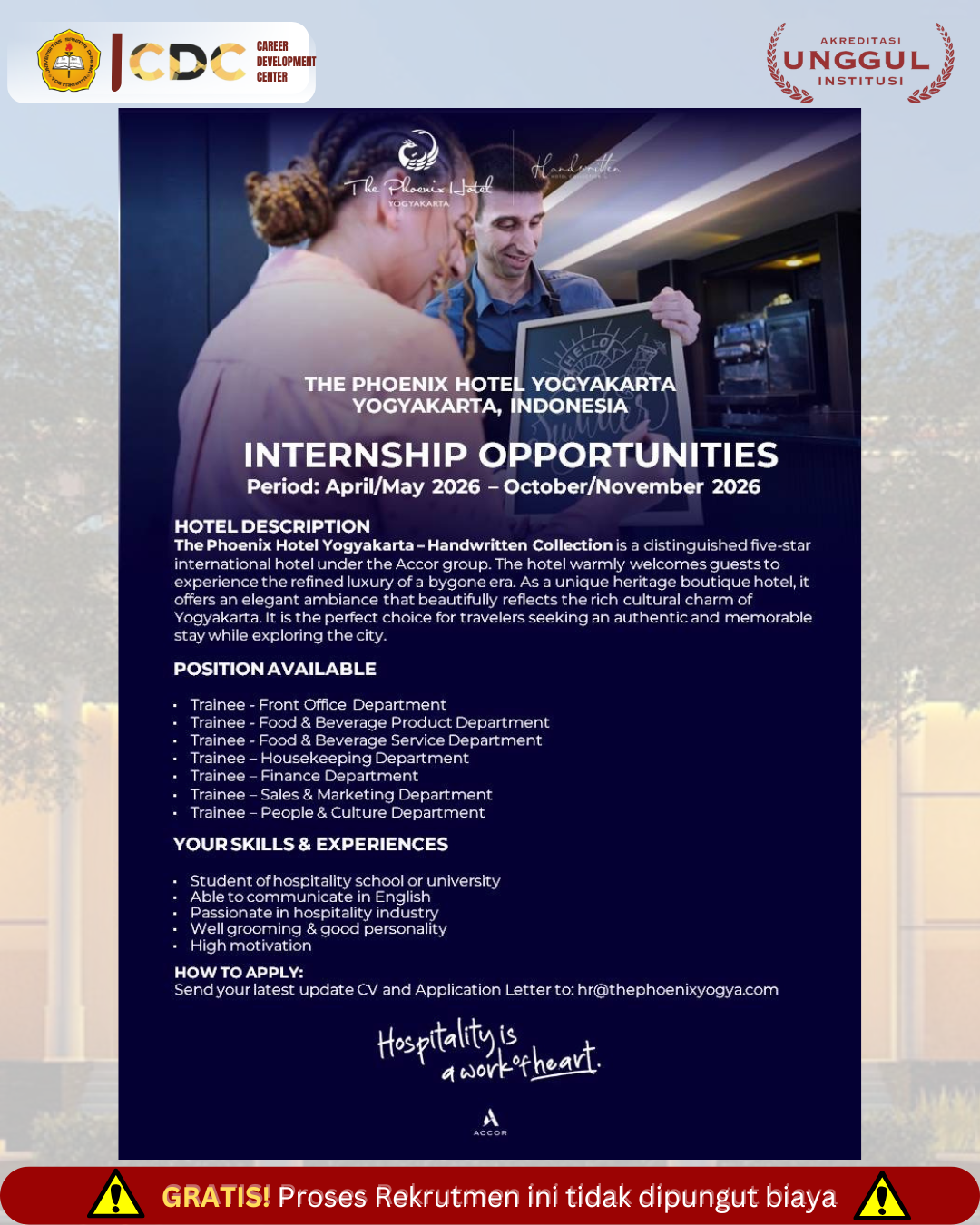 LOWONGAN The Phoenix Hotel Yogyakarta Dari : The Phoenix Hotel Yogyakarta Deadline : 30/11/2026 Ketegori : Daerah Istimewa Yogyakarta | Kodya, Yogyakarta